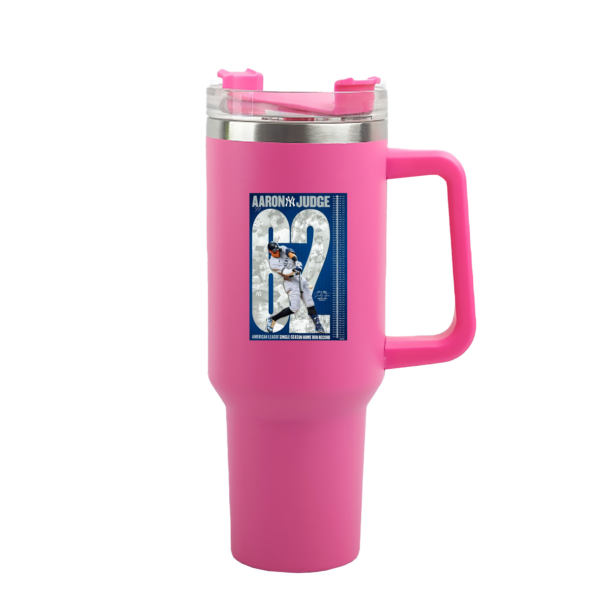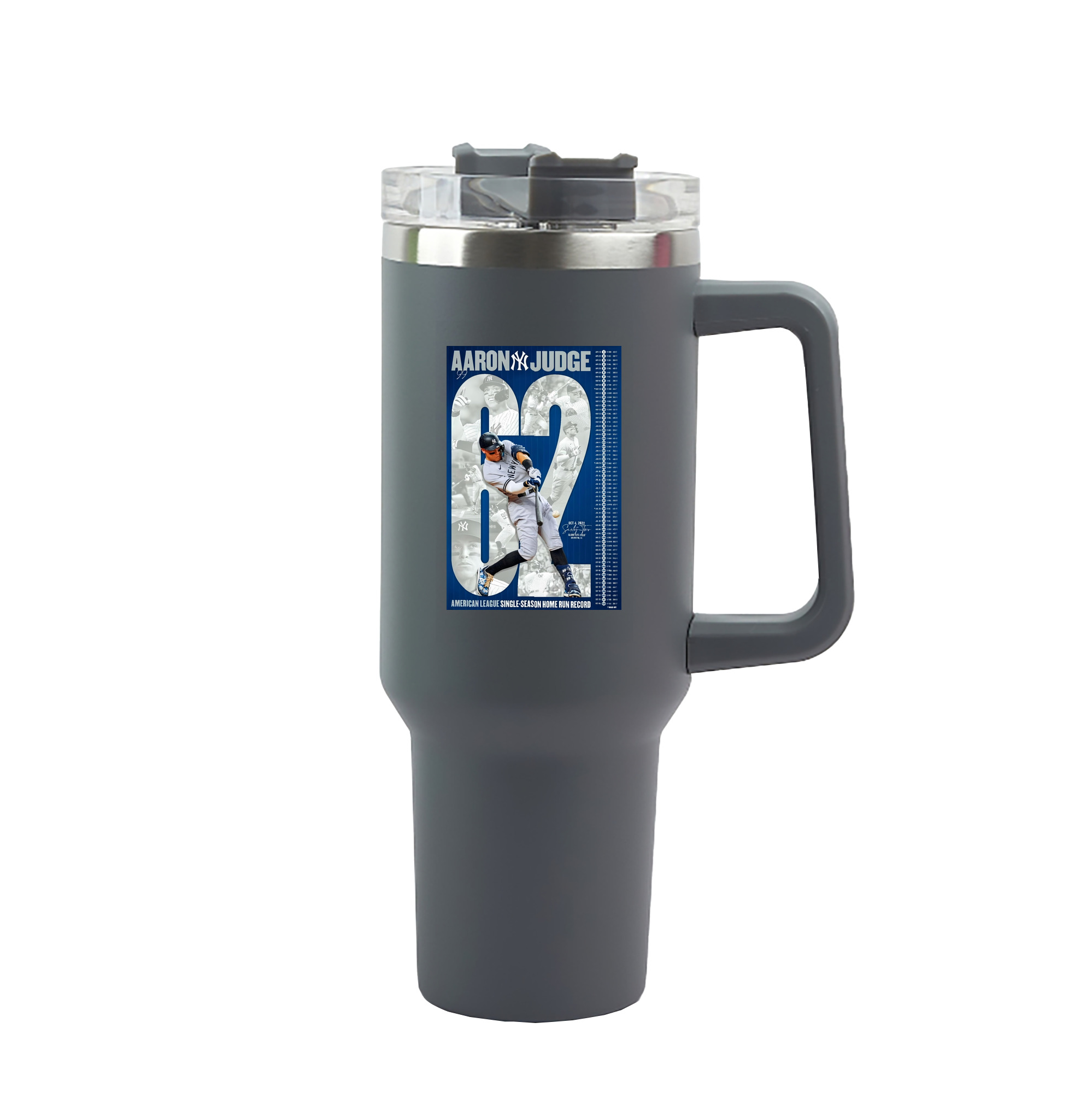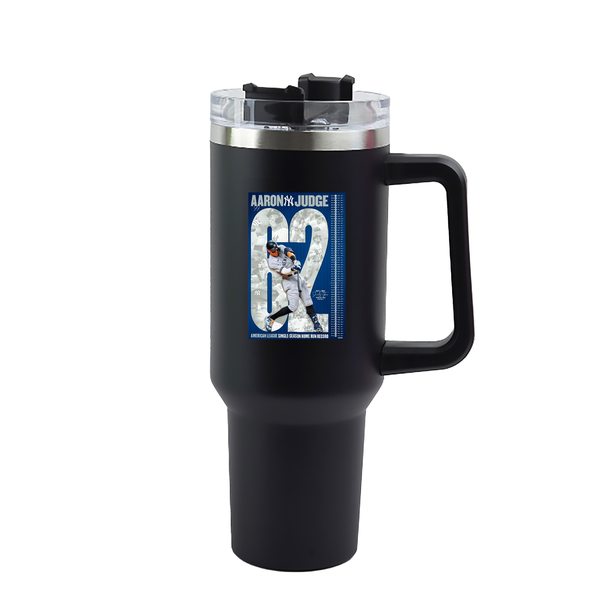 Aaron Judge AL Single Season 62 Home Run Record 40oz Handle Car Tumbler – Durable Stainless Steel Travel Mug With UV Print – Double Wall Insulated, Fits Most Car Cup Holders