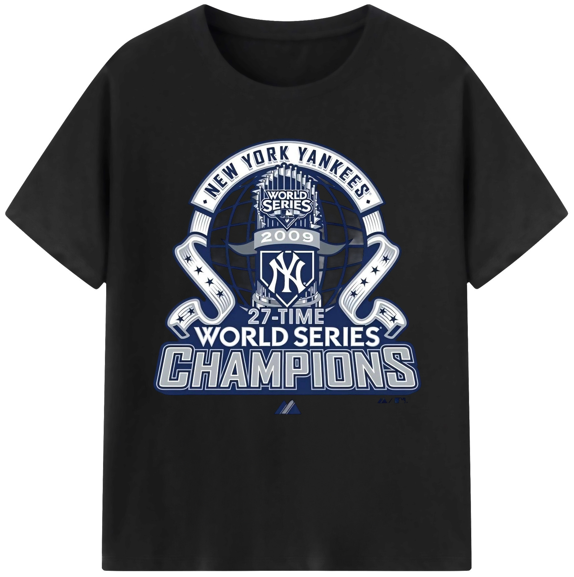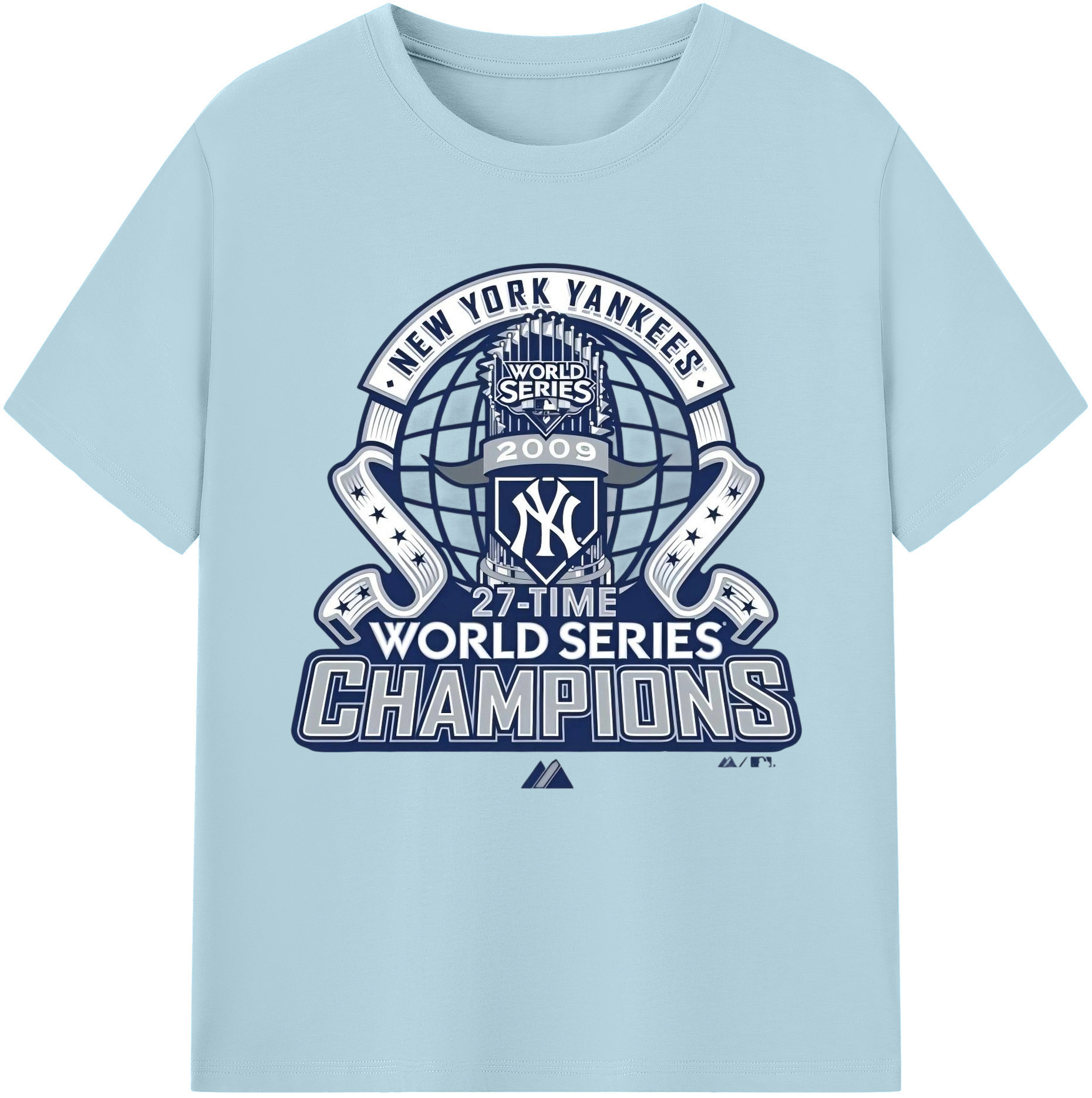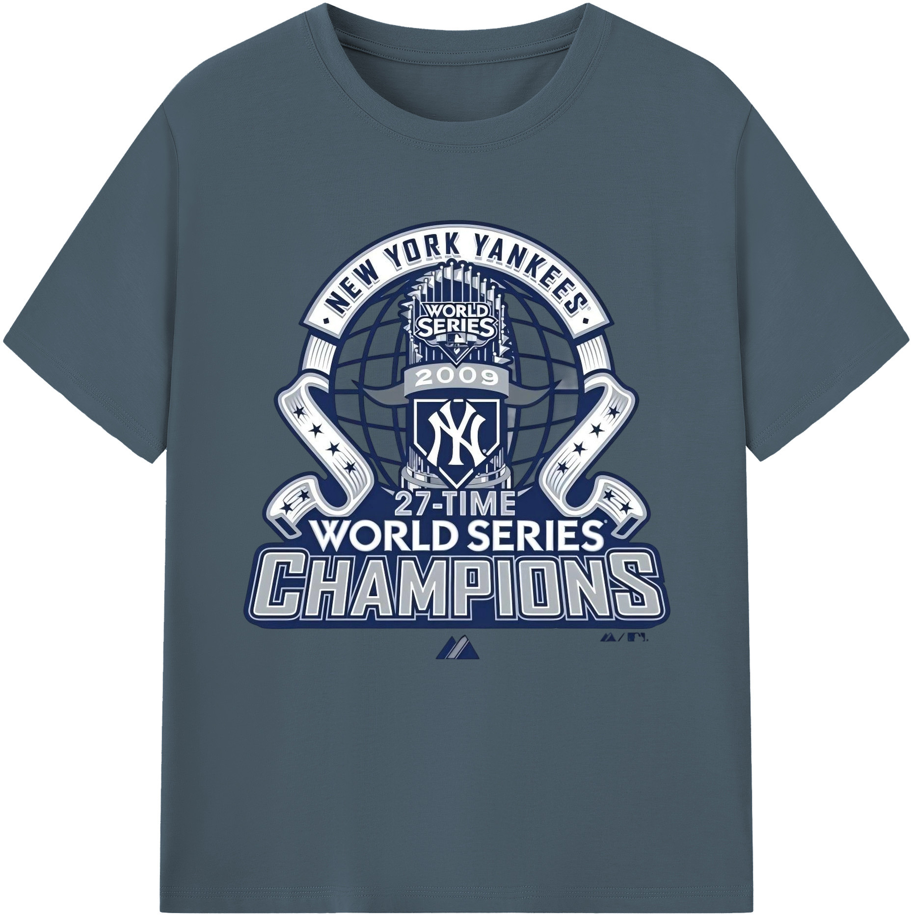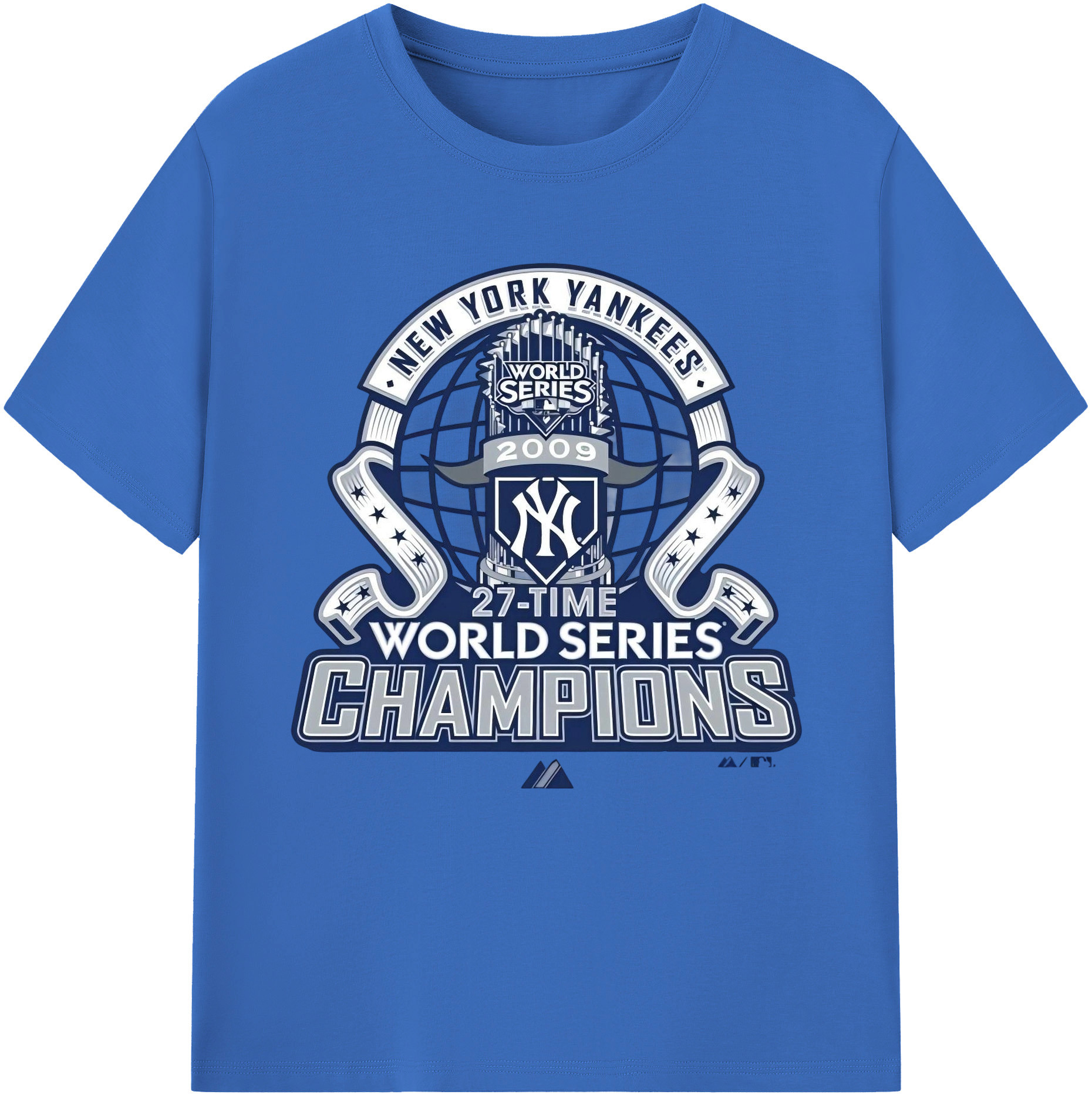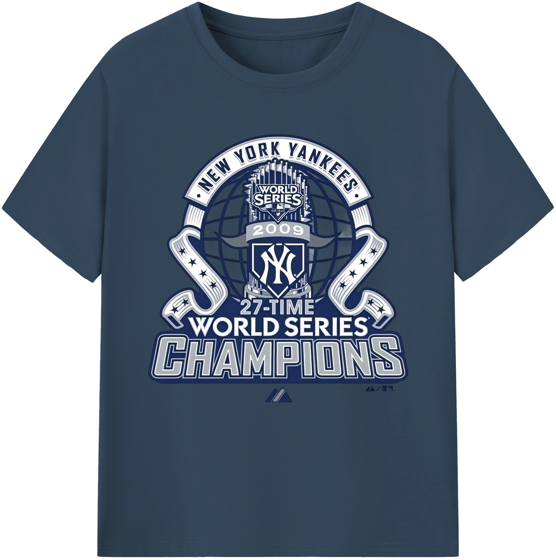 New York Yankees 2009 27th WS Champions Blue Combed Cotton T-Shirt 180g With Front Heat Transfer Print – Soft, Lightweight, Fitted Design – Stylish Casual Wear For Sports & Everyday Use