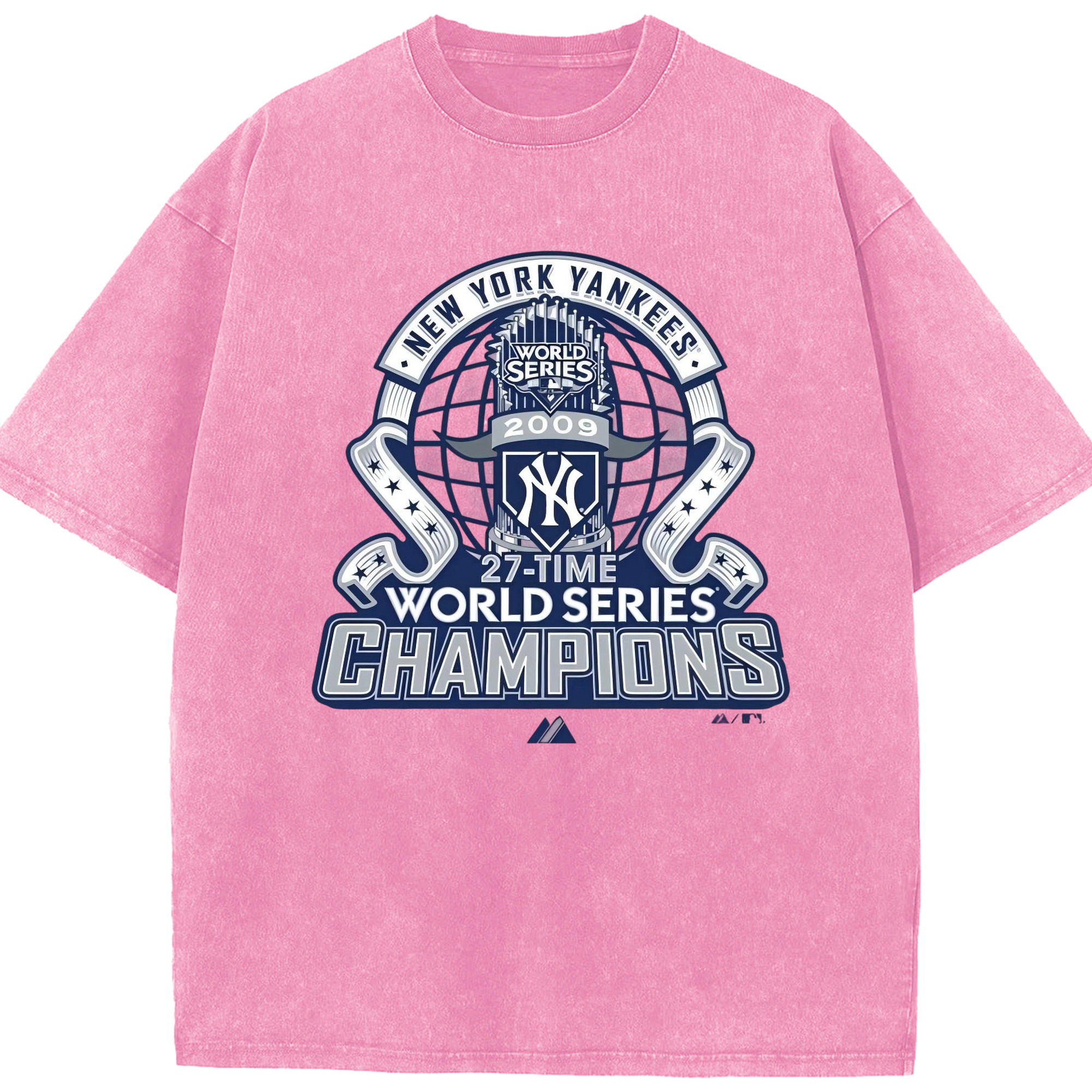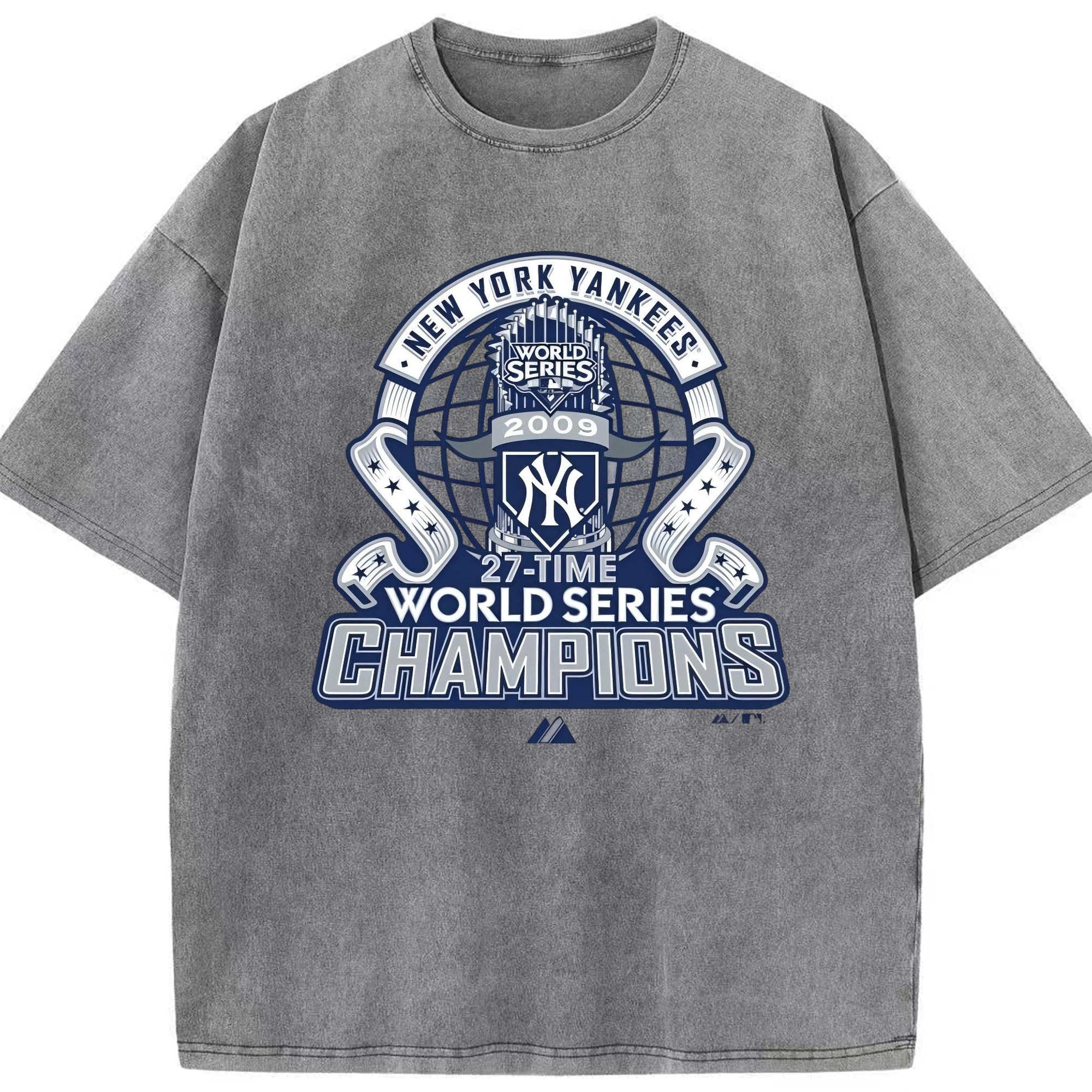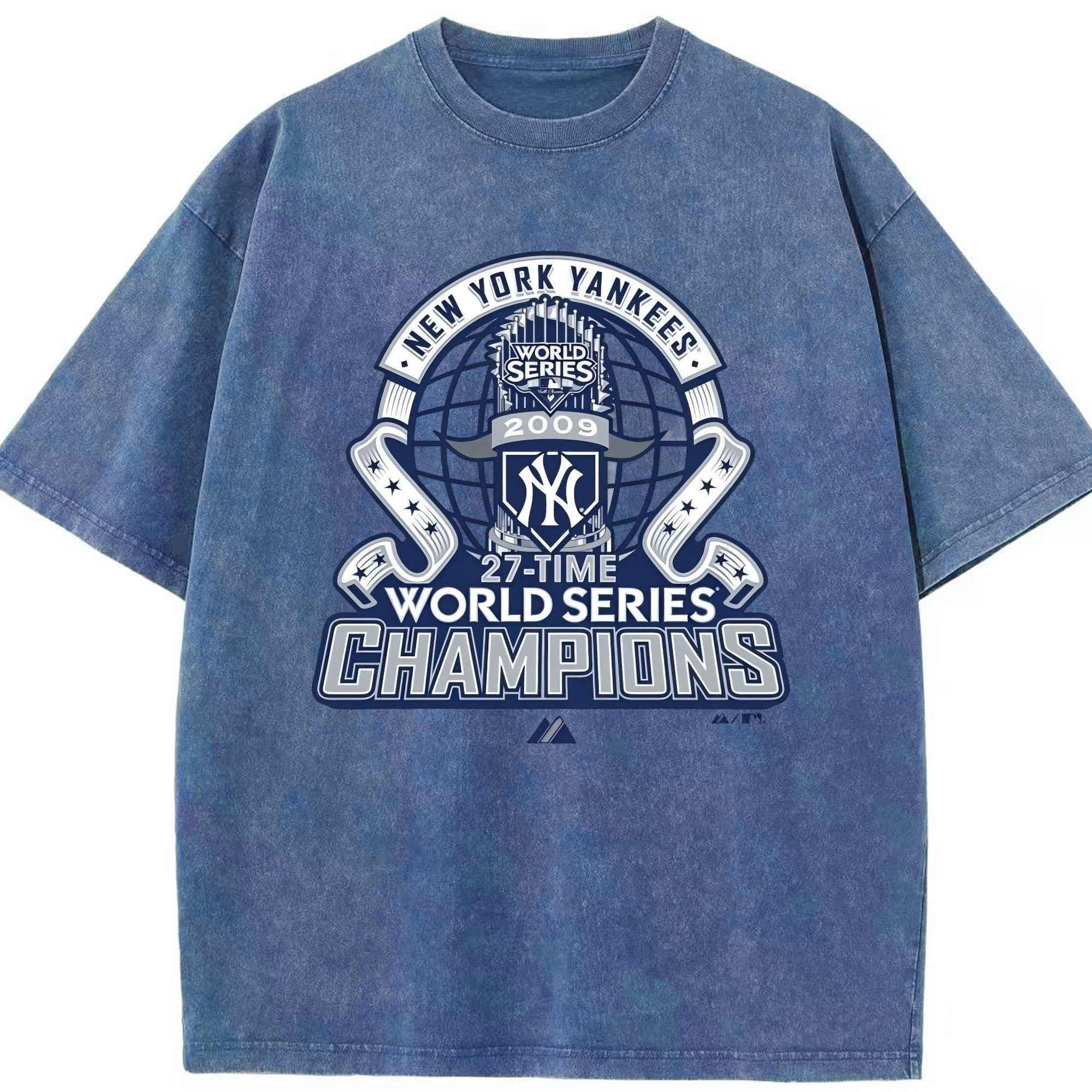 New York Yankees 2009 27th WS Champions Blue Washed Vintage Look 230g Cotton Oversized T-Shirt With Front Heat Transfer Print – Soft, Lightweight, Stylish Fit – Comfortable Casual Wear For Sports & Everyday Use