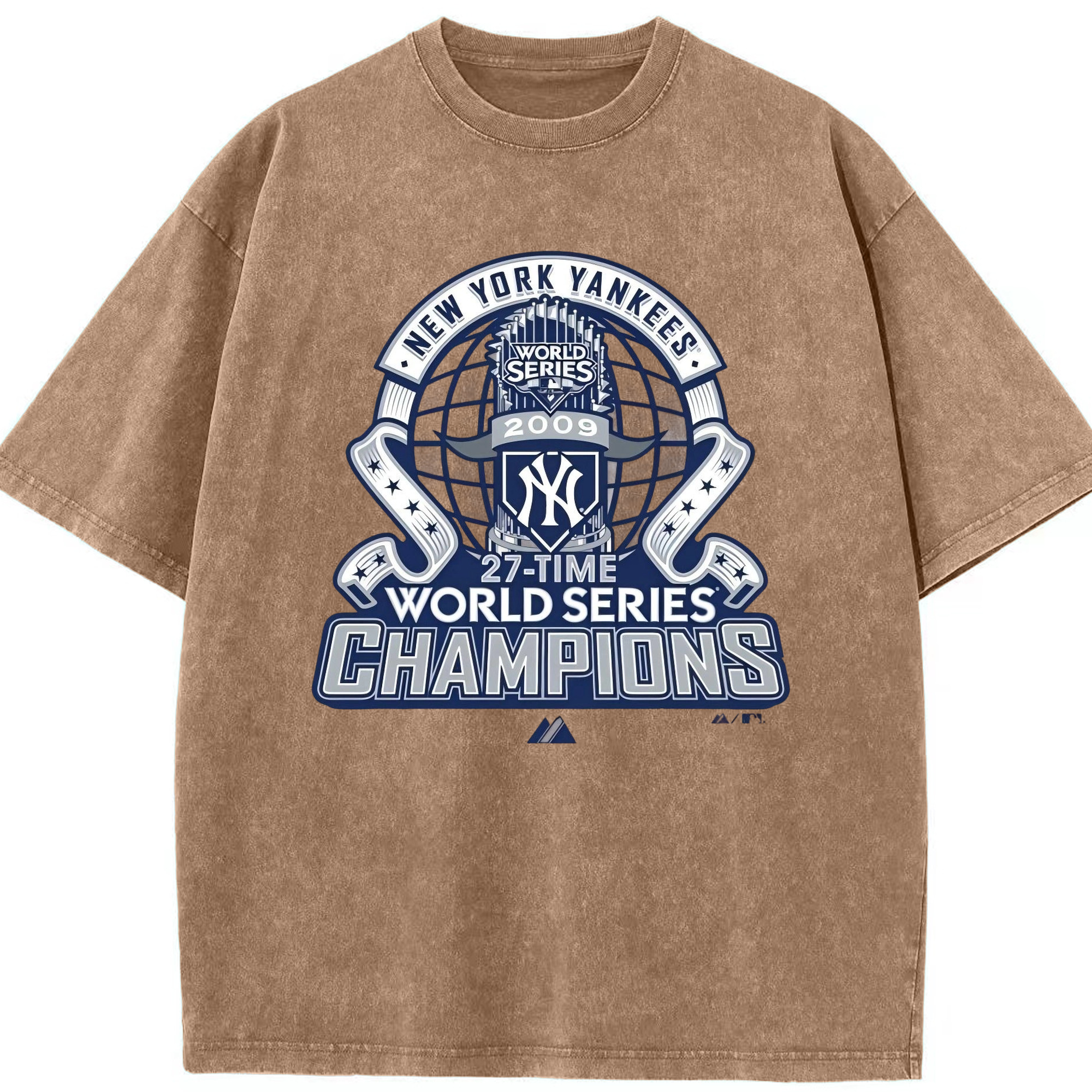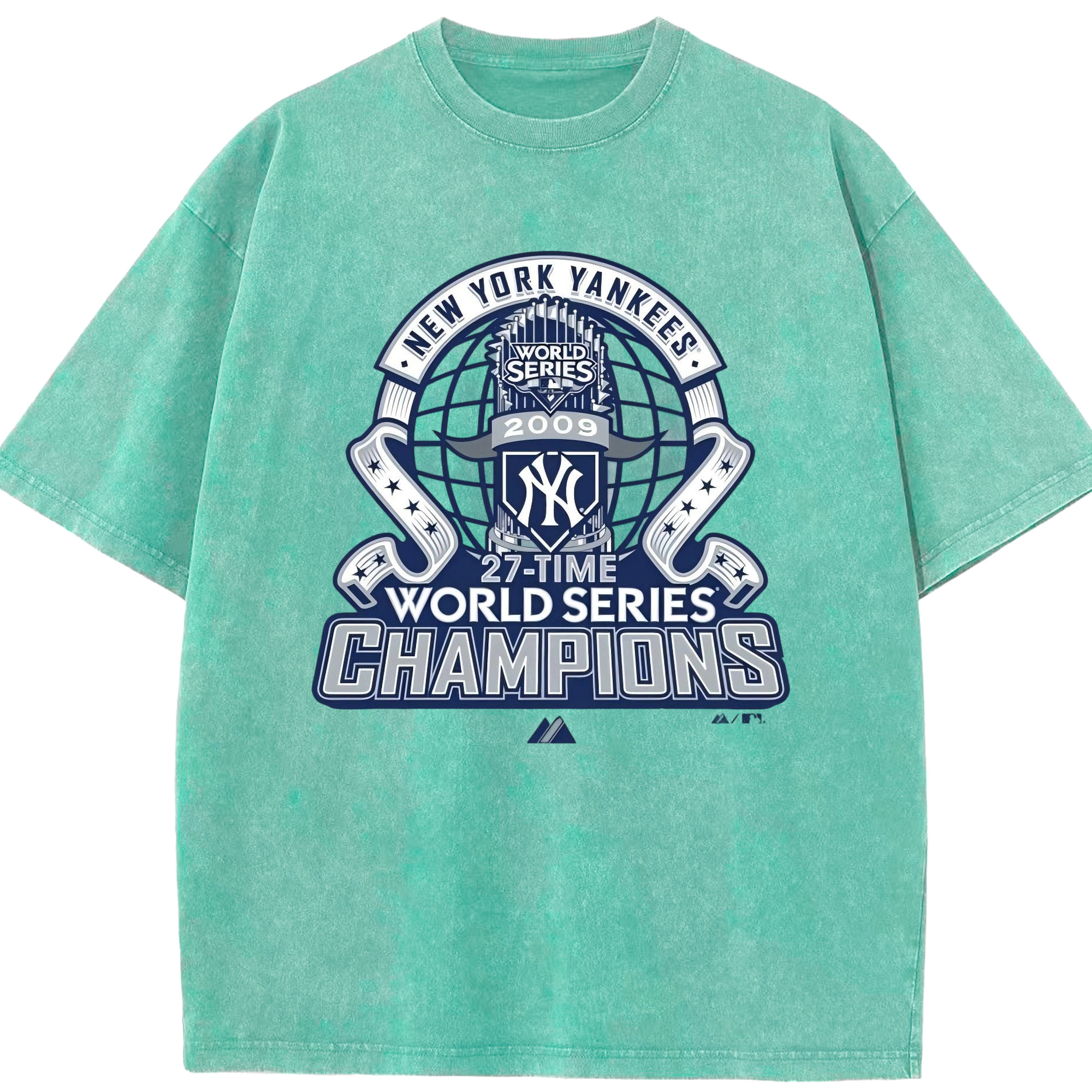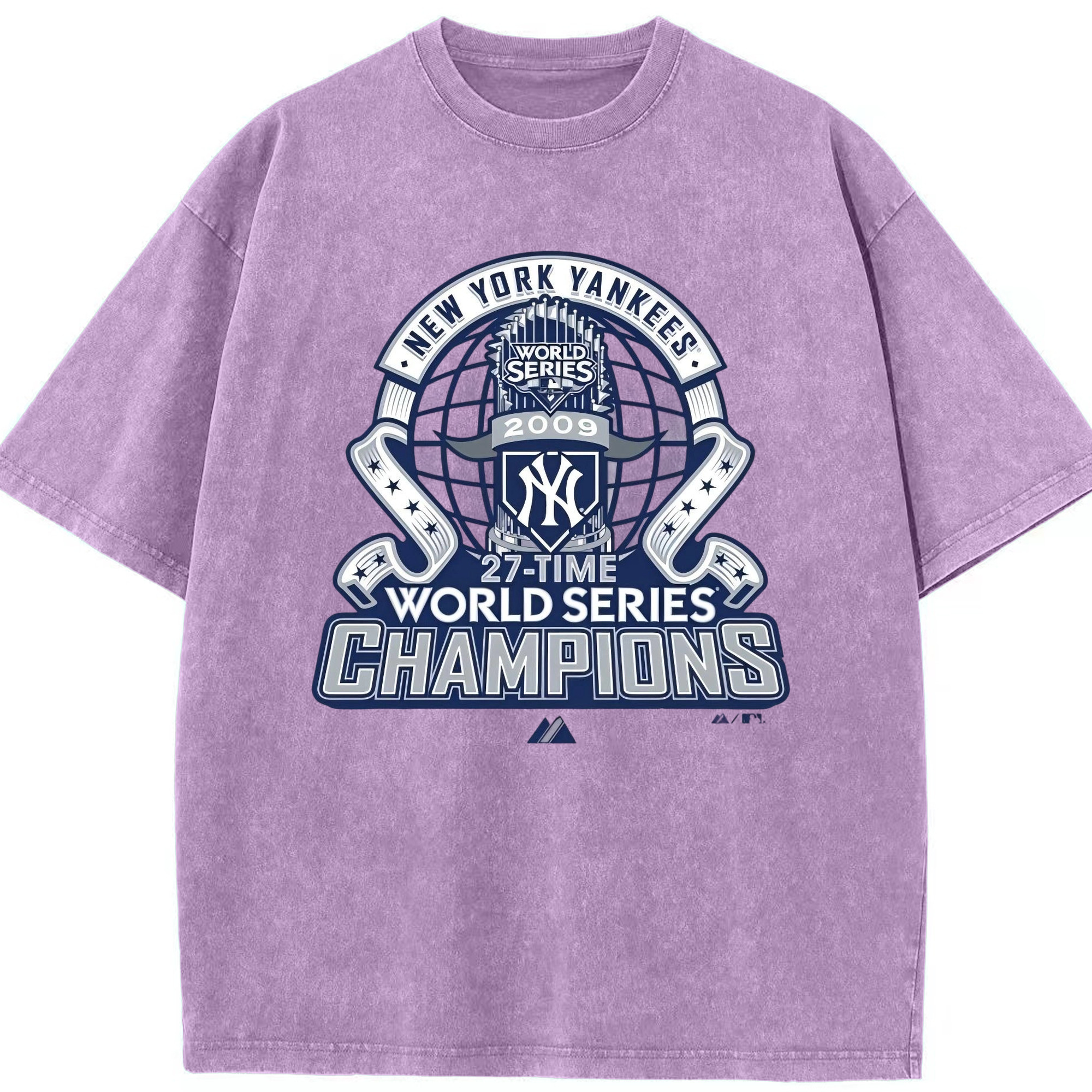New York Yankees 2009 27th WS Champions Blue Washed Vintage Look 230g Cotton Oversized T-Shirt With Front Heat Transfer Print – Soft, Lightweight, Stylish Fit – Comfortable Casual Wear For Sports & Everyday Use