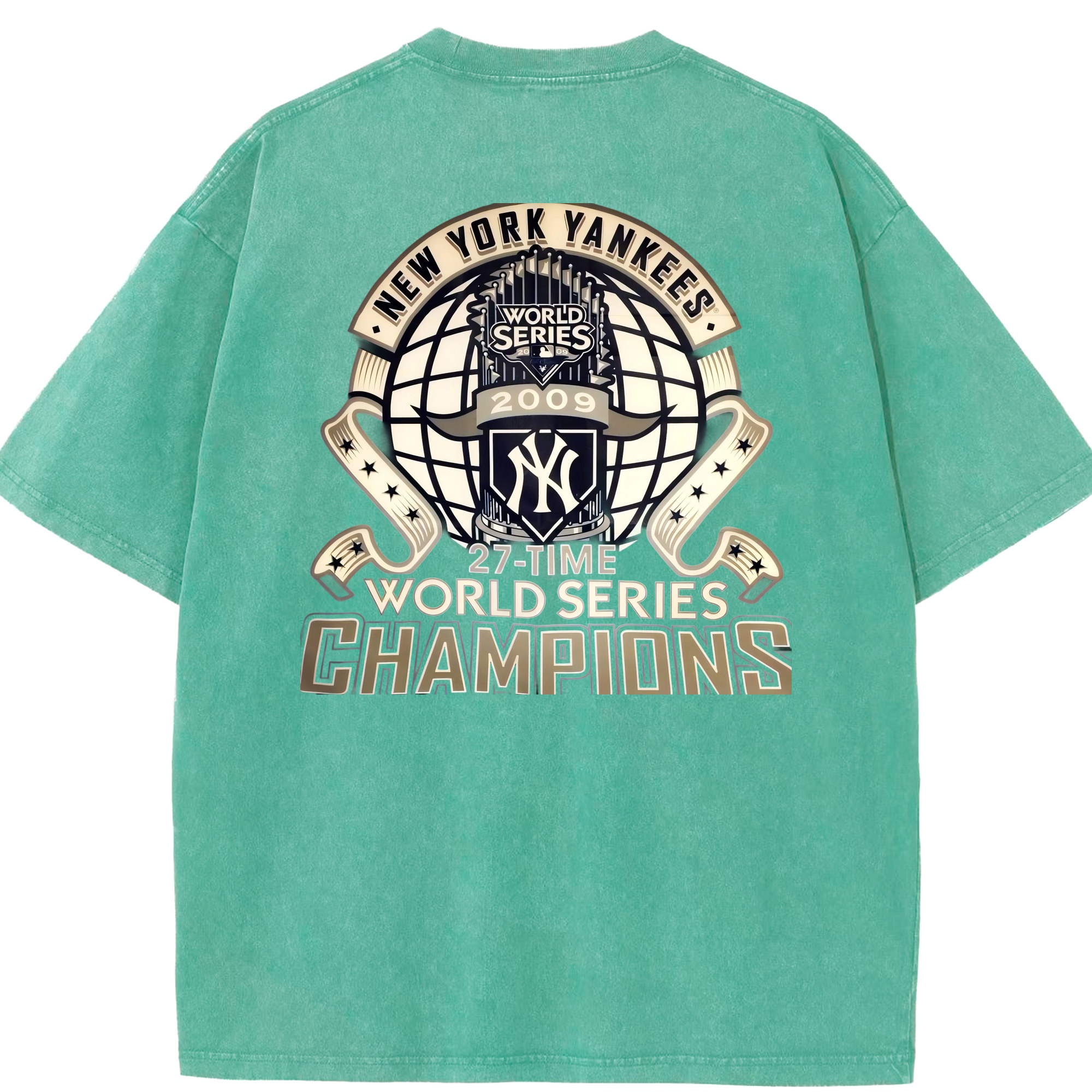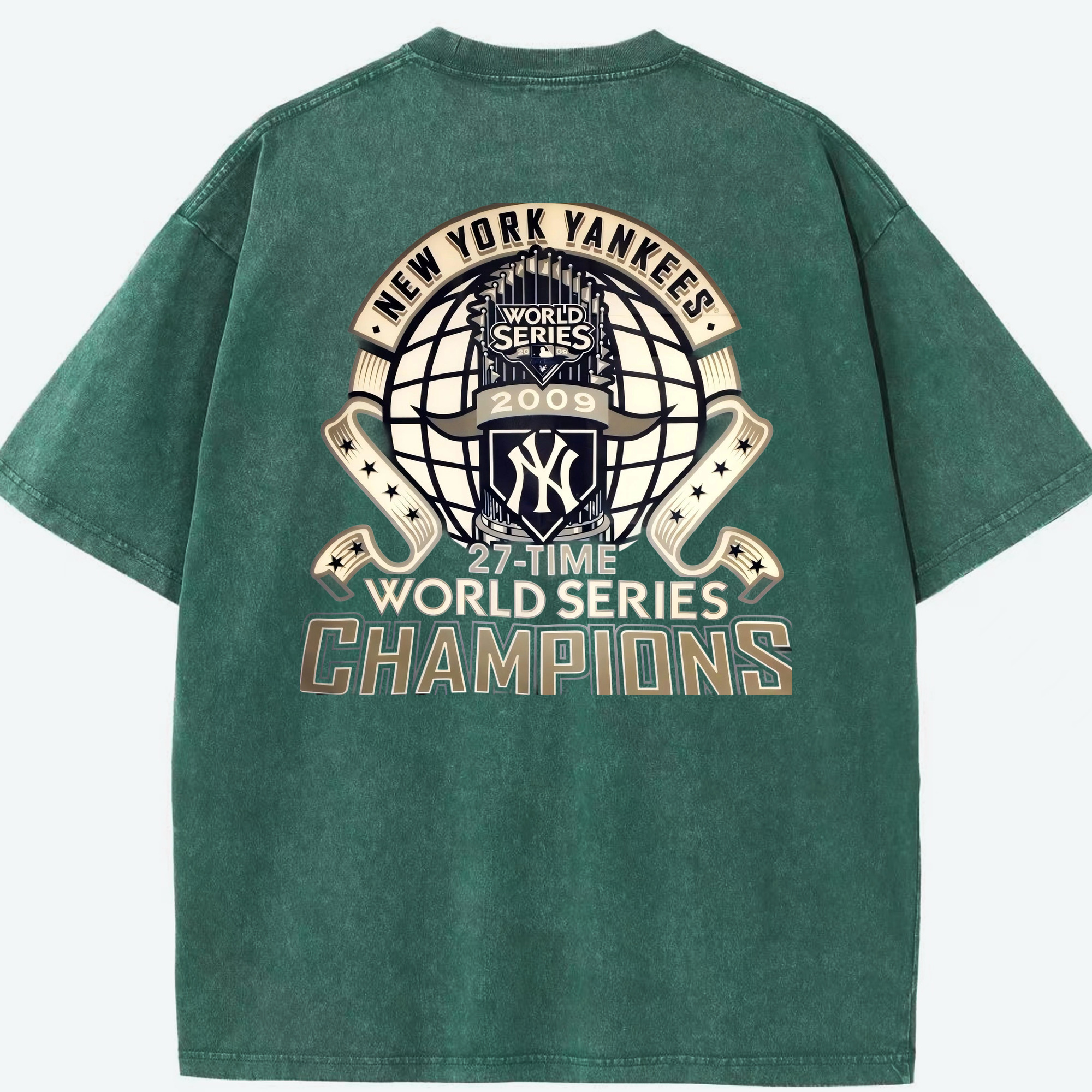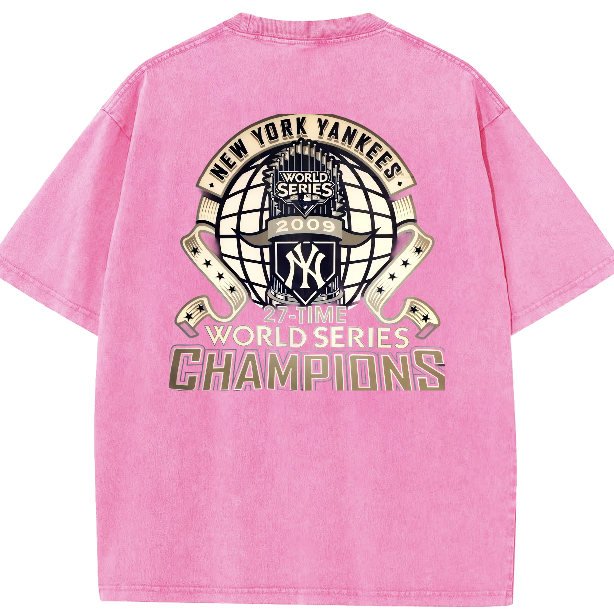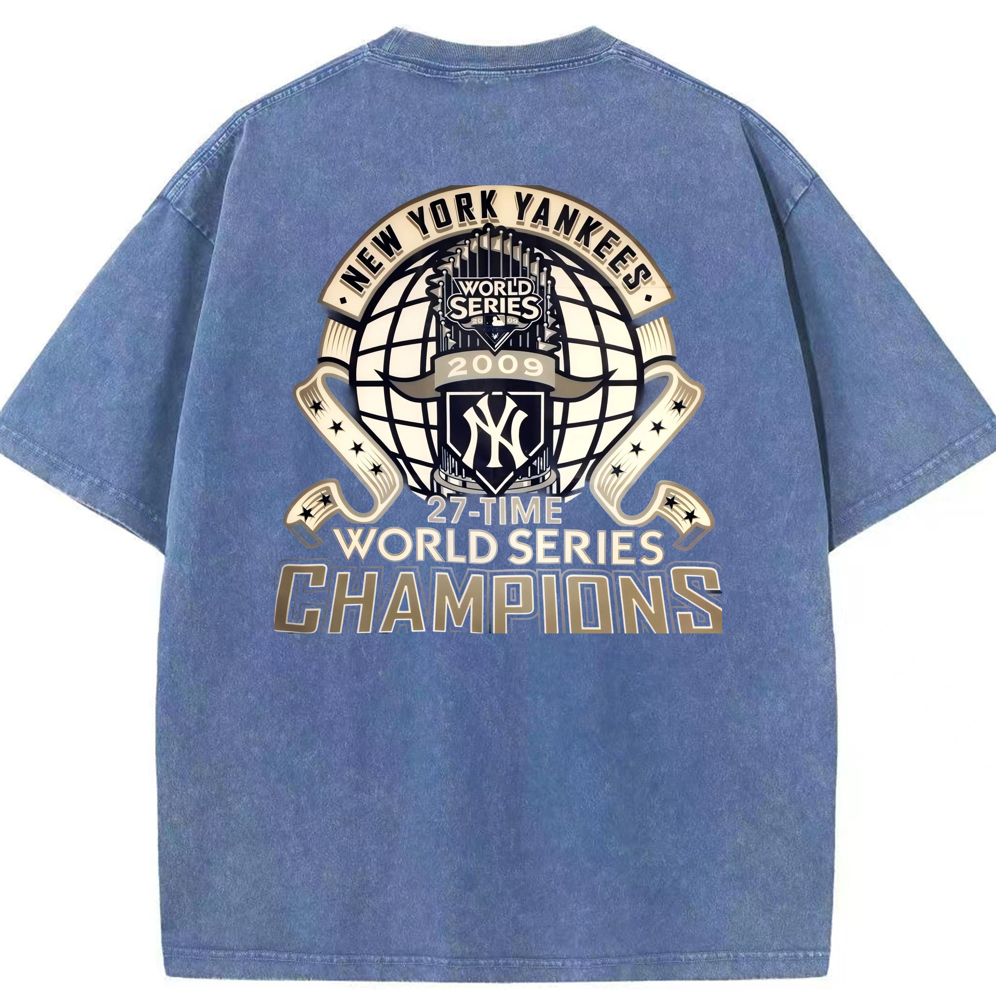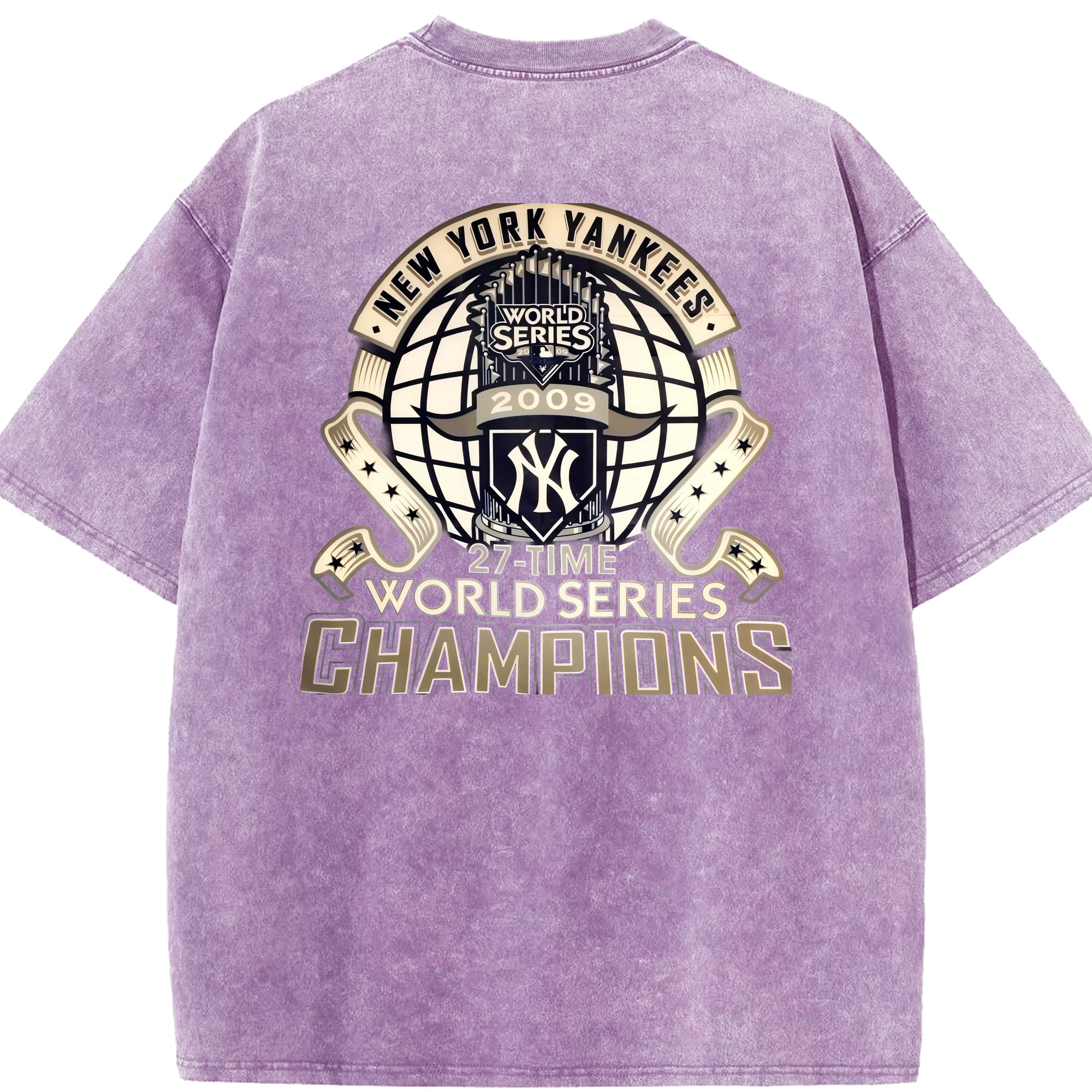 New York Yankees 2009 27th WS Champions Golden Washed Vintage 230g Cotton Oversized T-Shirt With Back Heat Transfer Print – Soft, Lightweight & Stylish – Comfortable Casual Wear For Sports & Everyday Use