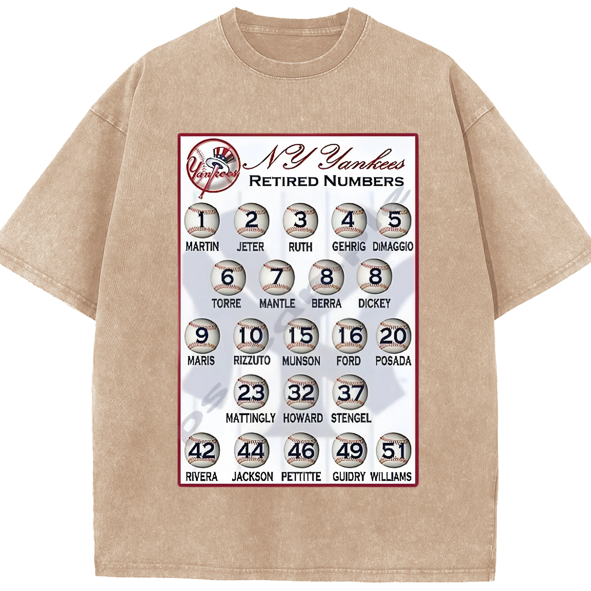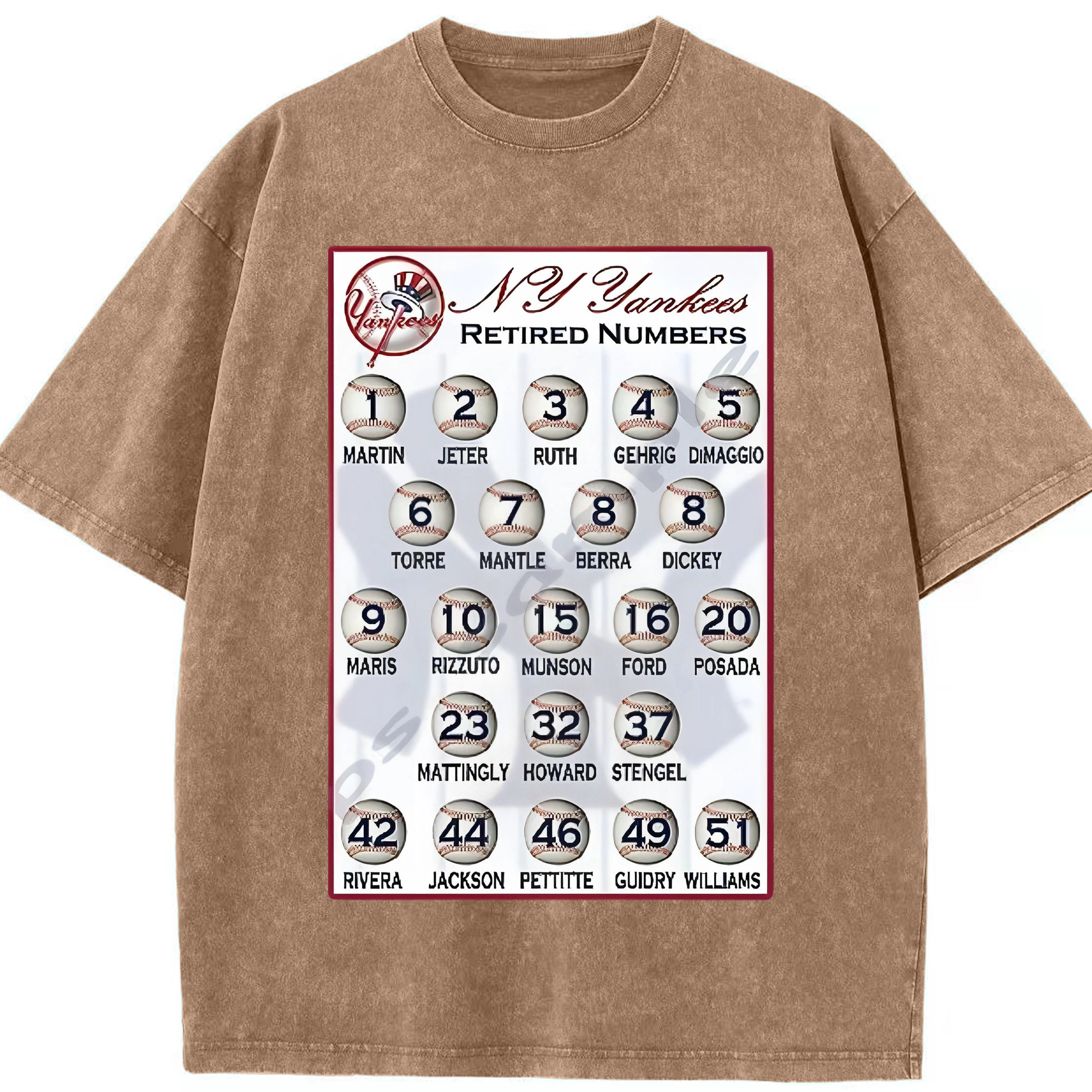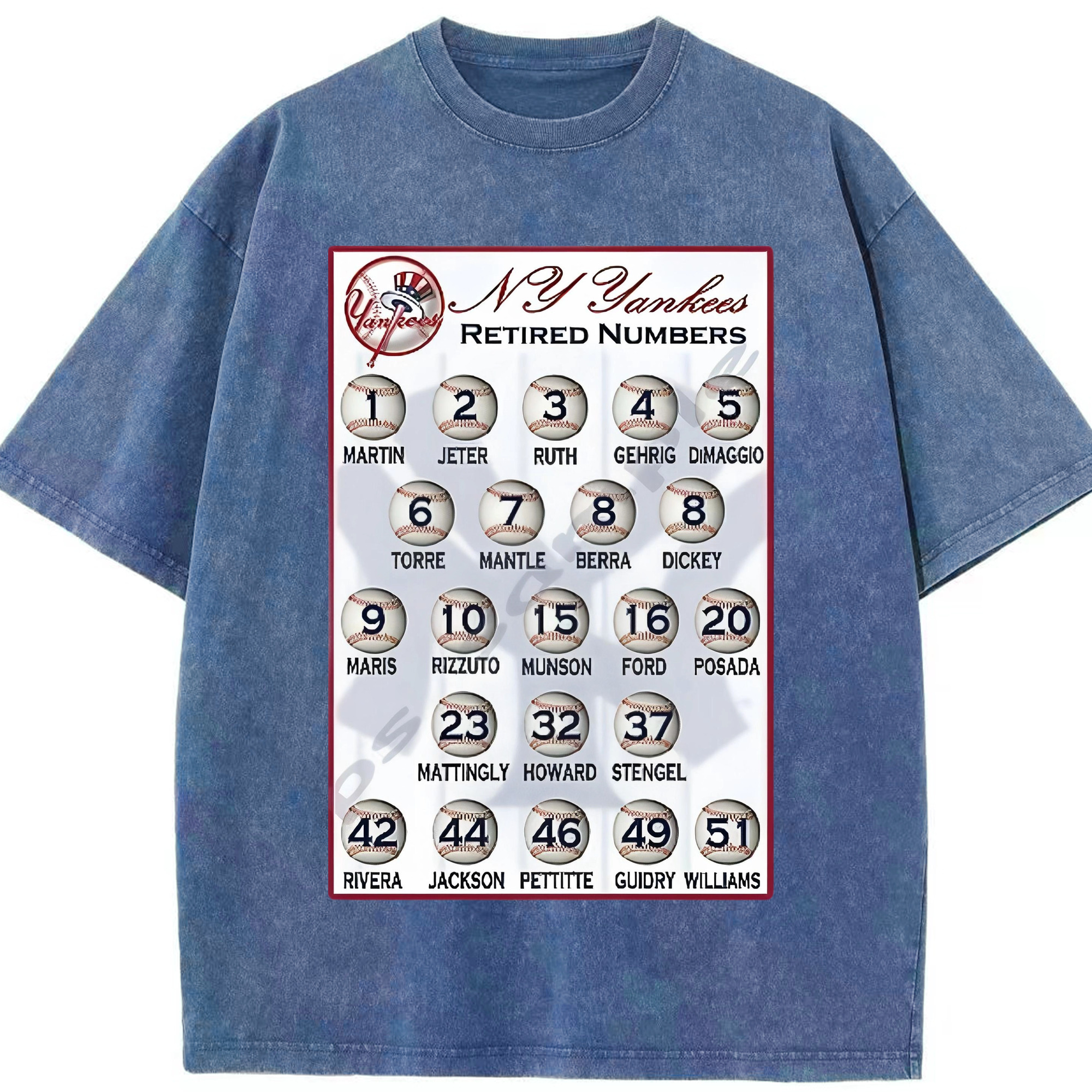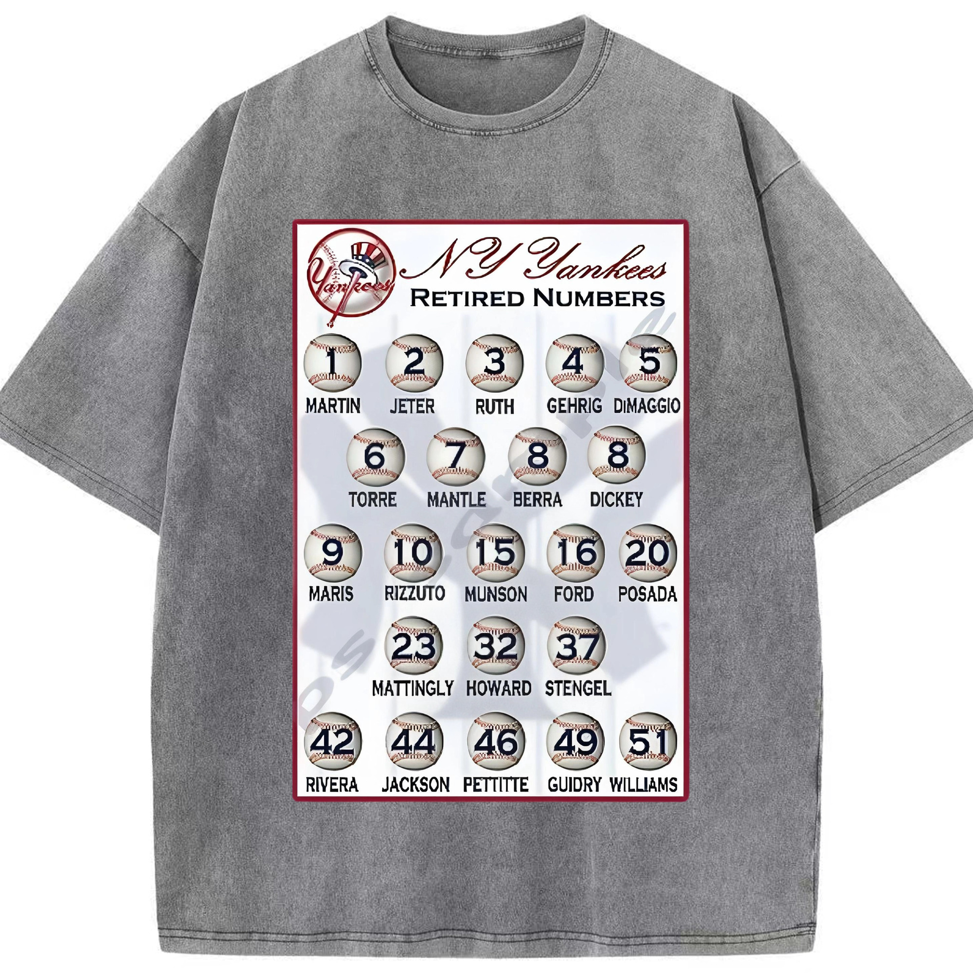 New York Yankees Retired Numbers Washed Vintage Look 230g Cotton Oversized T-Shirt With Front Heat Transfer Print – Soft, Lightweight, Stylish Fit – Comfortable Casual Wear For Sports & Everyday Use