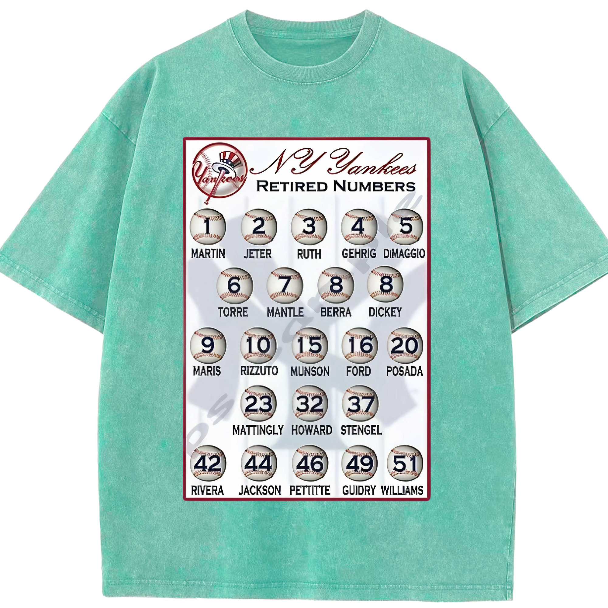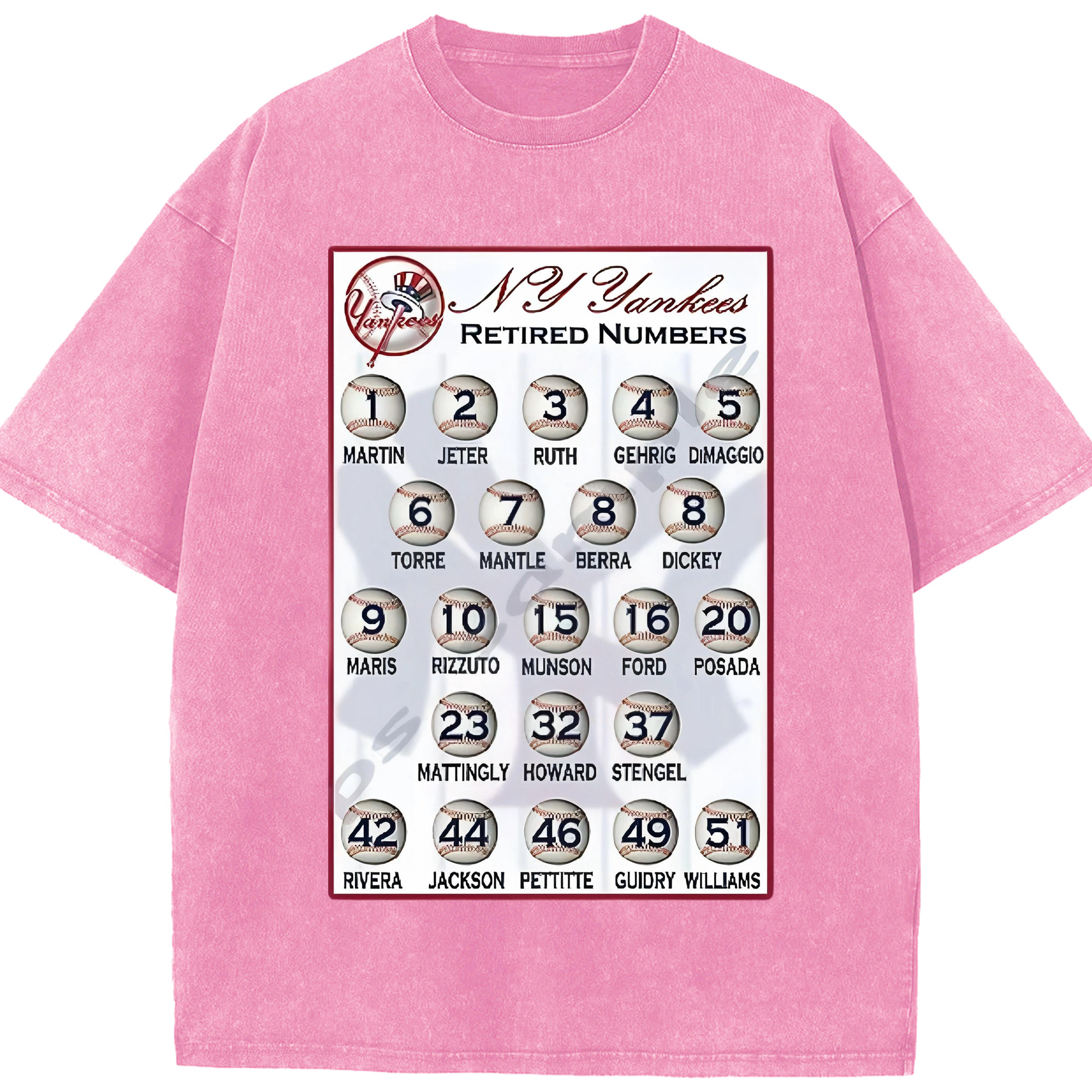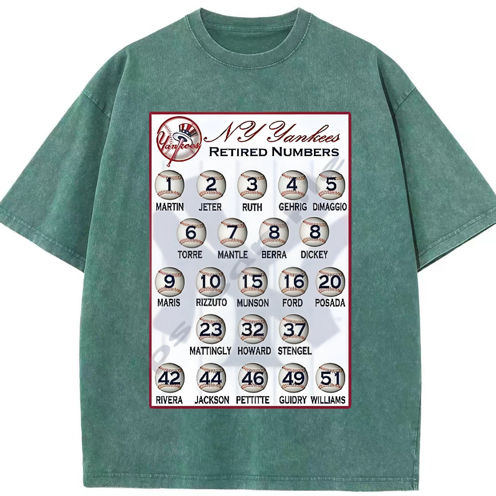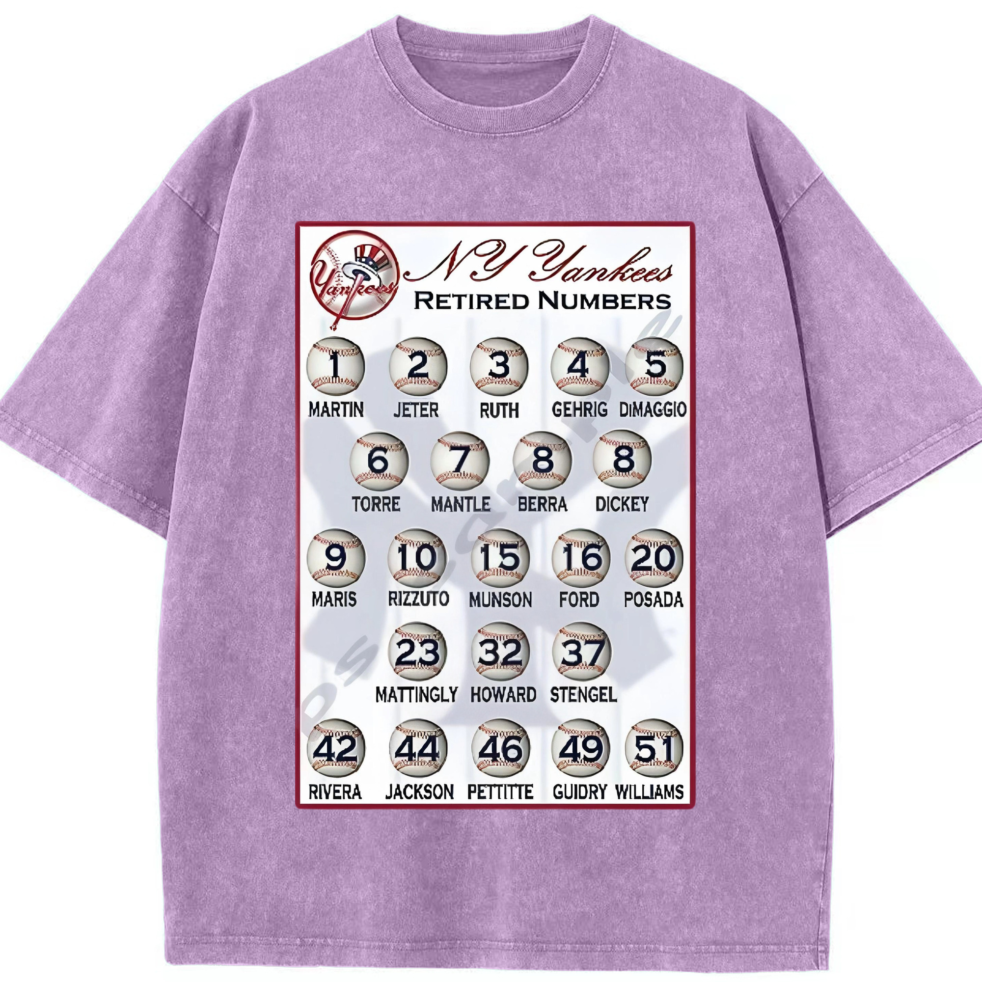 New York Yankees Retired Numbers Washed Vintage Look 230g Cotton Oversized T-Shirt With Front Heat Transfer Print – Soft, Lightweight, Stylish Fit – Comfortable Casual Wear For Sports & Everyday Use